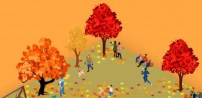 Billedet viser en efterårslegeplads, hvor mennesker og børn går rundt. Alle har travlt med at lave deres egne ting, men ved siden af nogle af dem ligger de græskar, vi leder efter.
