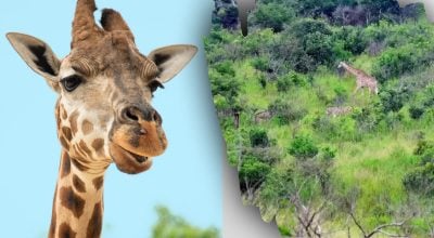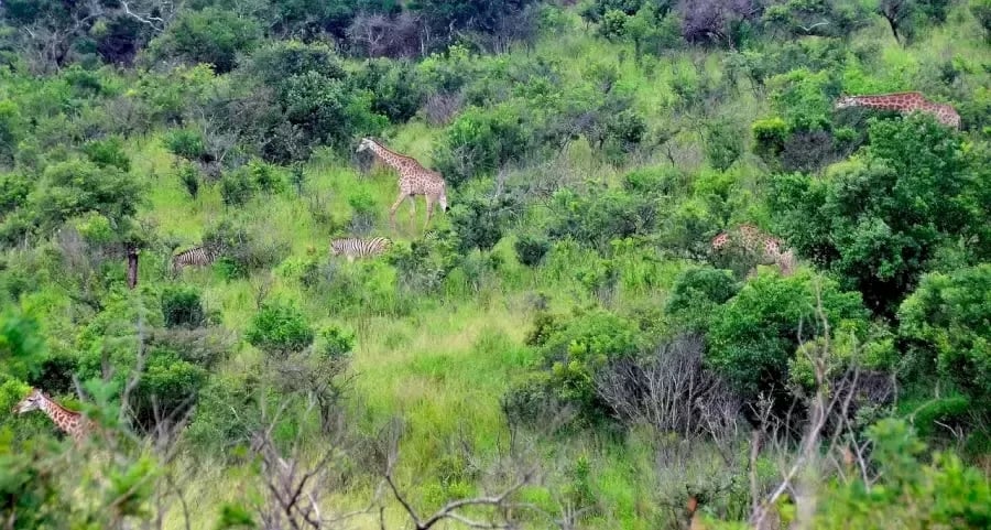 Vi ser en gruppe dyr vandre rundt mellem grønne træer og buske. Der er et vist antal giraffer og zebraer på billedet. Men det er ikke let at tælle det nøjagtige antal. Når alt kommer til alt, er nogle dyr tydeligt synlige, men samtidig kan nogle af dem være skjult for vores øjne.