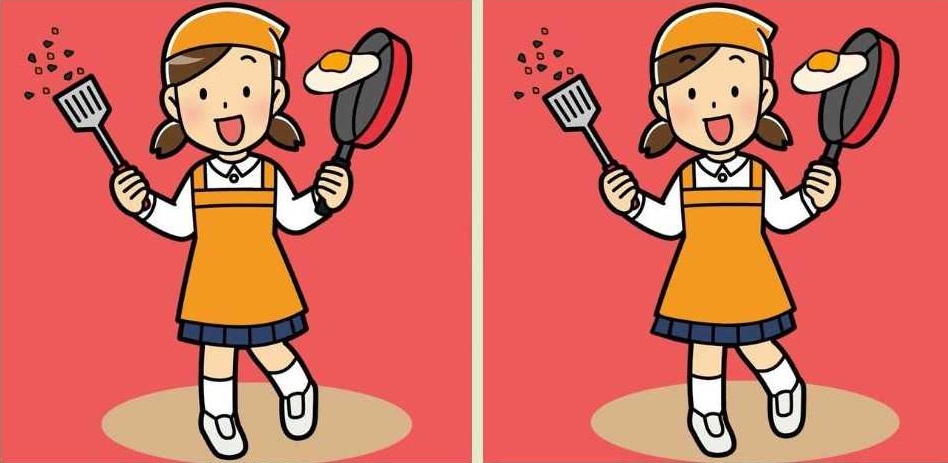 Begge tegninger viser en pige, der laver røræg. Og hun ser ud til at have problemer, for det stegte æg er ved at falde ned på gulvet fra stegepanden.