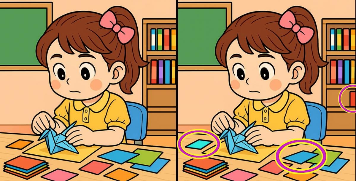 Så er du klar til den næste udfordring? Se nærmere på to billeder af en pige, der laver papirfugle. De ser måske ens ud ved første øjekast, men der er 3 små forskelle. Tror du, at du kan finde dem alle på 19 sekunder? Prøv det, og test din synsstyrke!